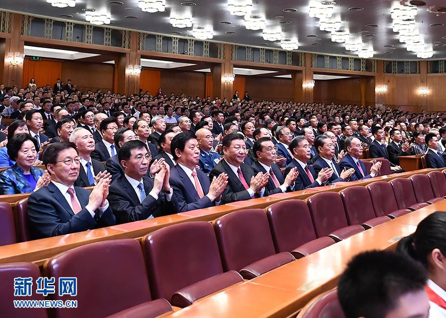 人民大會堂萬人大禮堂處處歡聲笑語。二樓眺臺的橫幅格外醒目:緊密團結在以習近平同志為核心的黨中央周圍,不忘初心、牢記使命,奮力奪取新時代中國特色社會主義偉大勝利!大會堂天幕上,投映著姹紫嫣紅的鮮花圖案,營造出熱烈喜慶的氣氛。兩面紅旗造型的舞臺墻矗立在臺口,36名儀仗兵分列兩側。